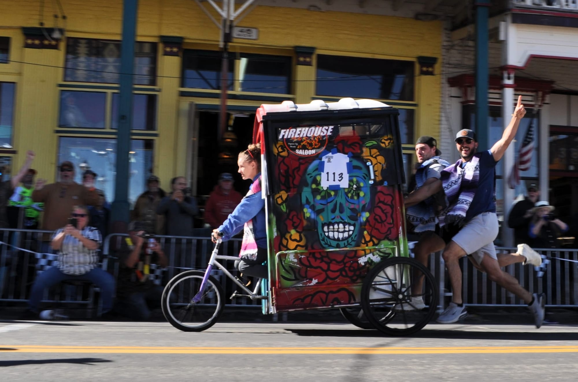 The festivities kicked off Saturday with the Parade of Outhouses, giving teams a chance to show off their prized creations, many of which have become annual fan favorites. The races started with a bang – courtesy of Rick Ireland – as two teams of pushers and drivers sprinted uphill for a grueling 10 seconds or less to a photo finish.