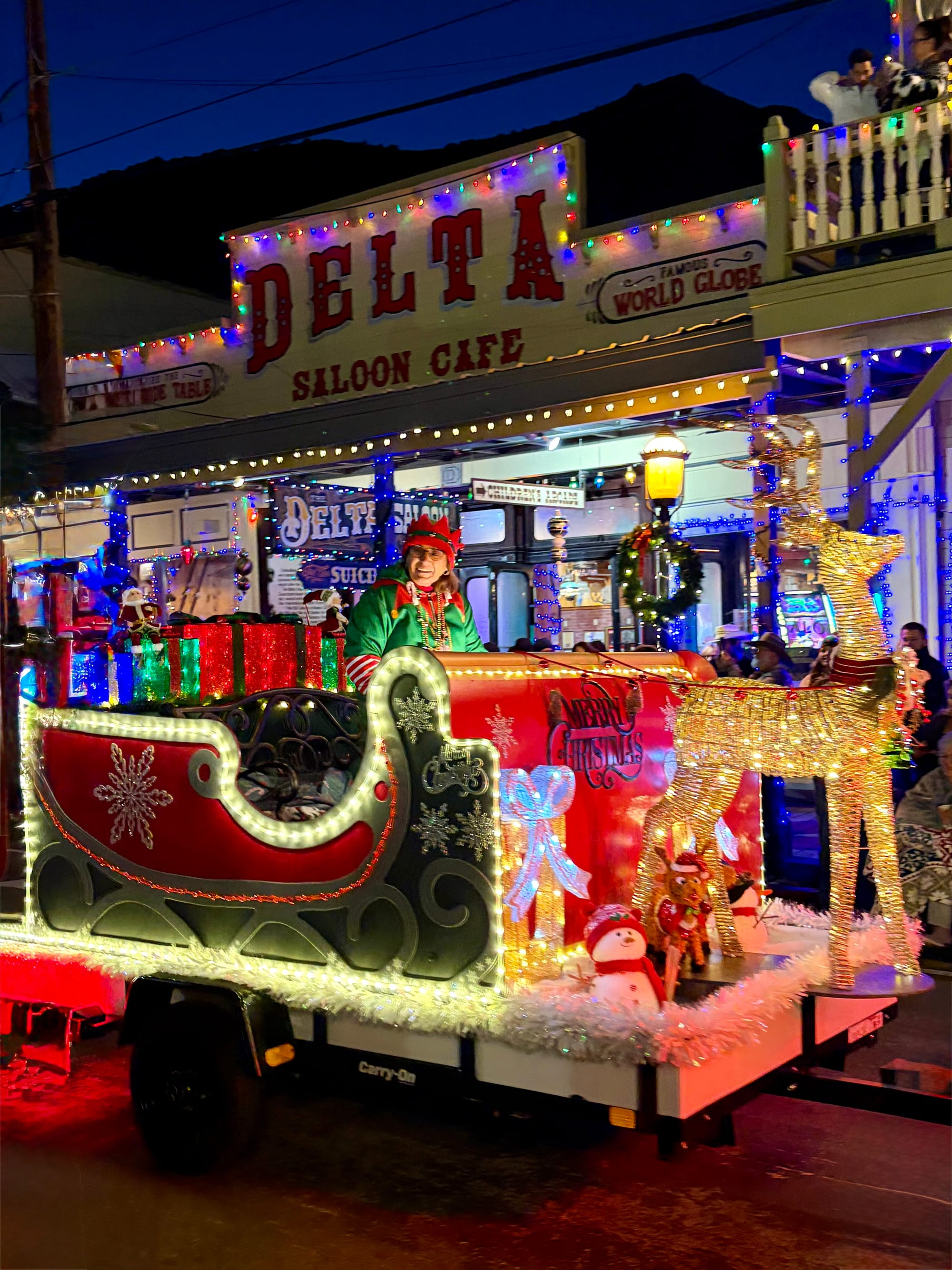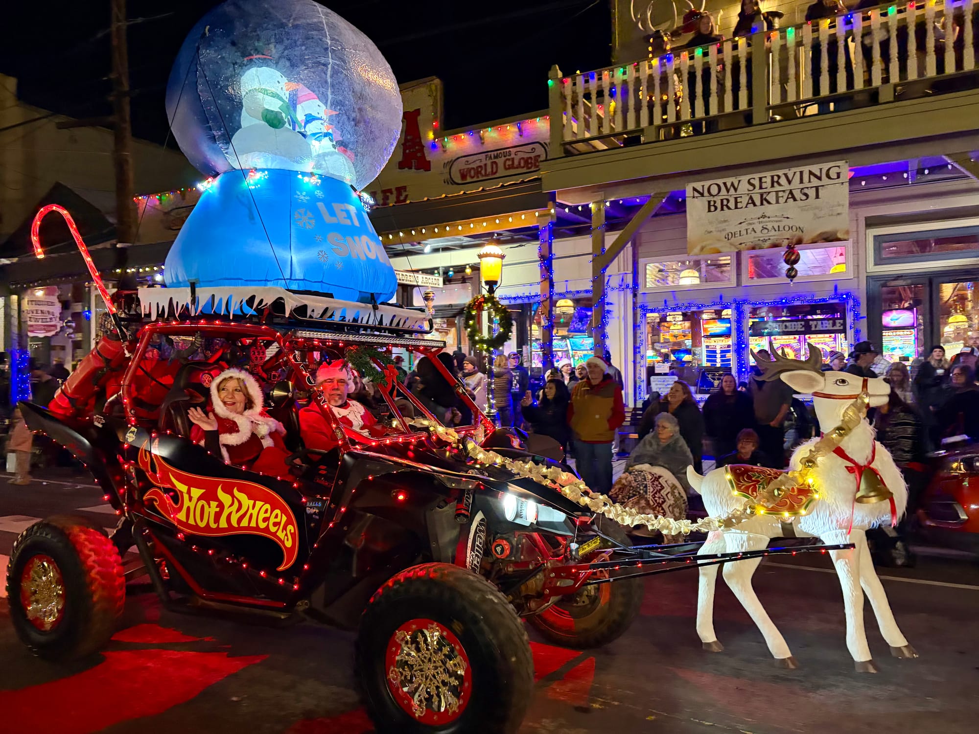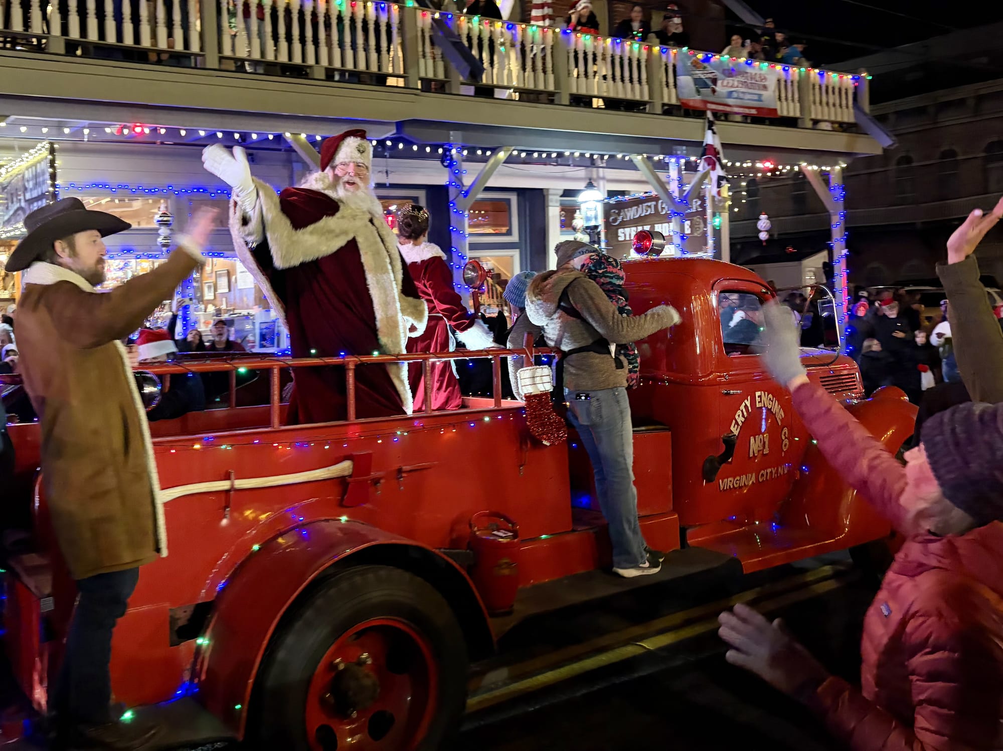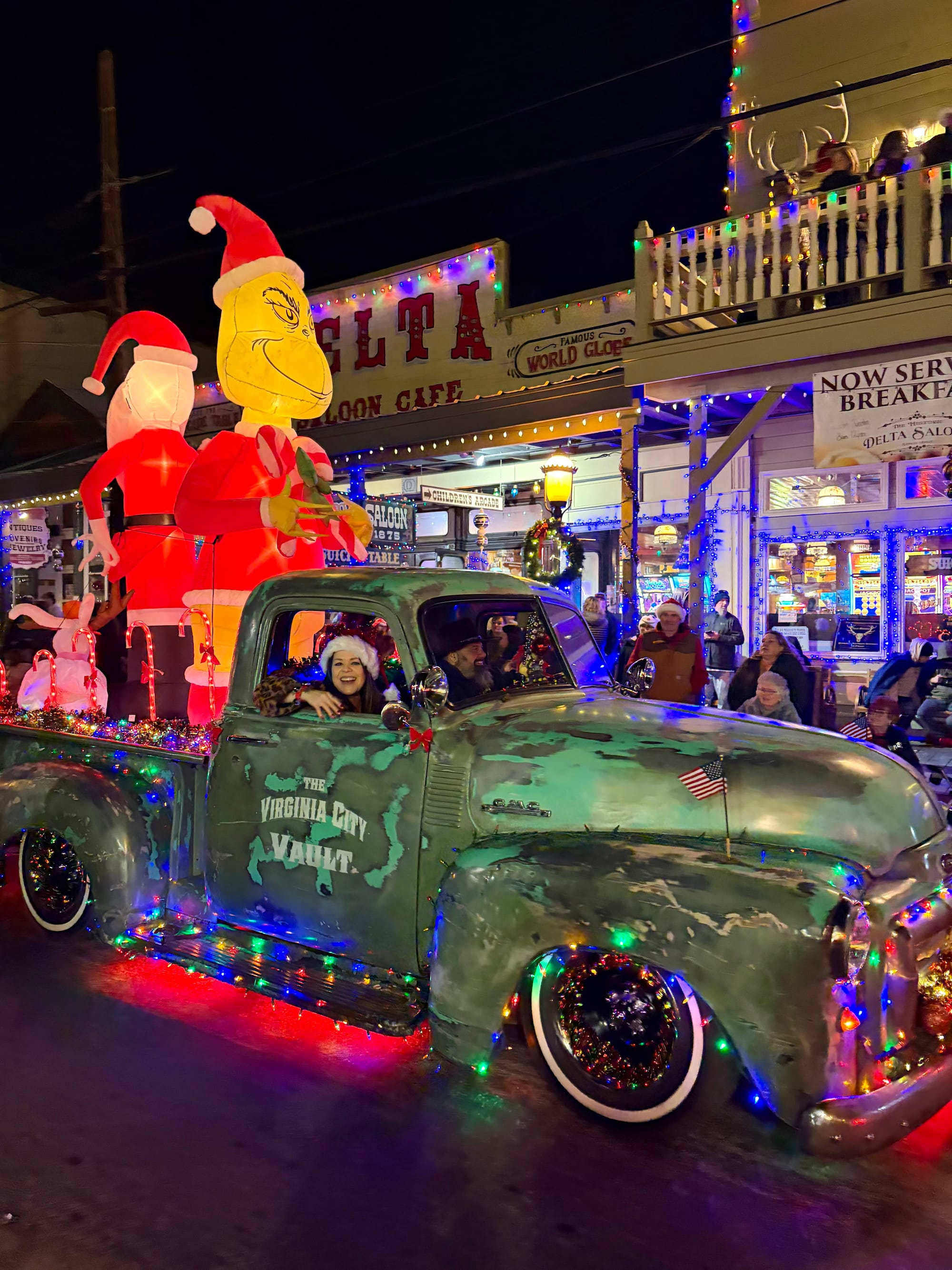 Trucks honked and revved their engines, grabbing the crowd’s attention. One truck carried an inflatable outhouse – a nod to Virginia City’s annual Outhouse Races. The Delta Saloon and Sawdust Corner Steakhouse carriages also joined the parade, decorated in true Christmas spirit.