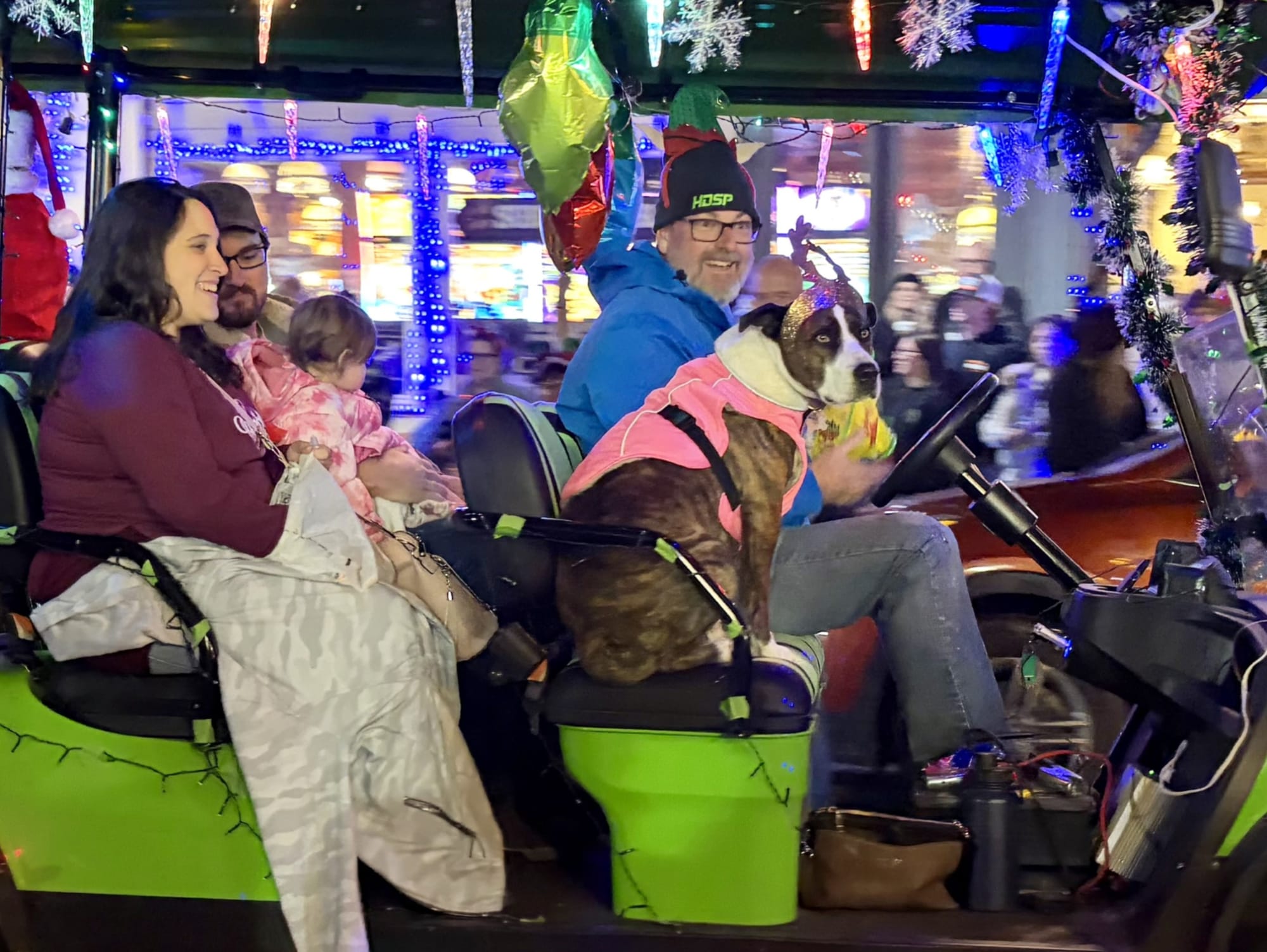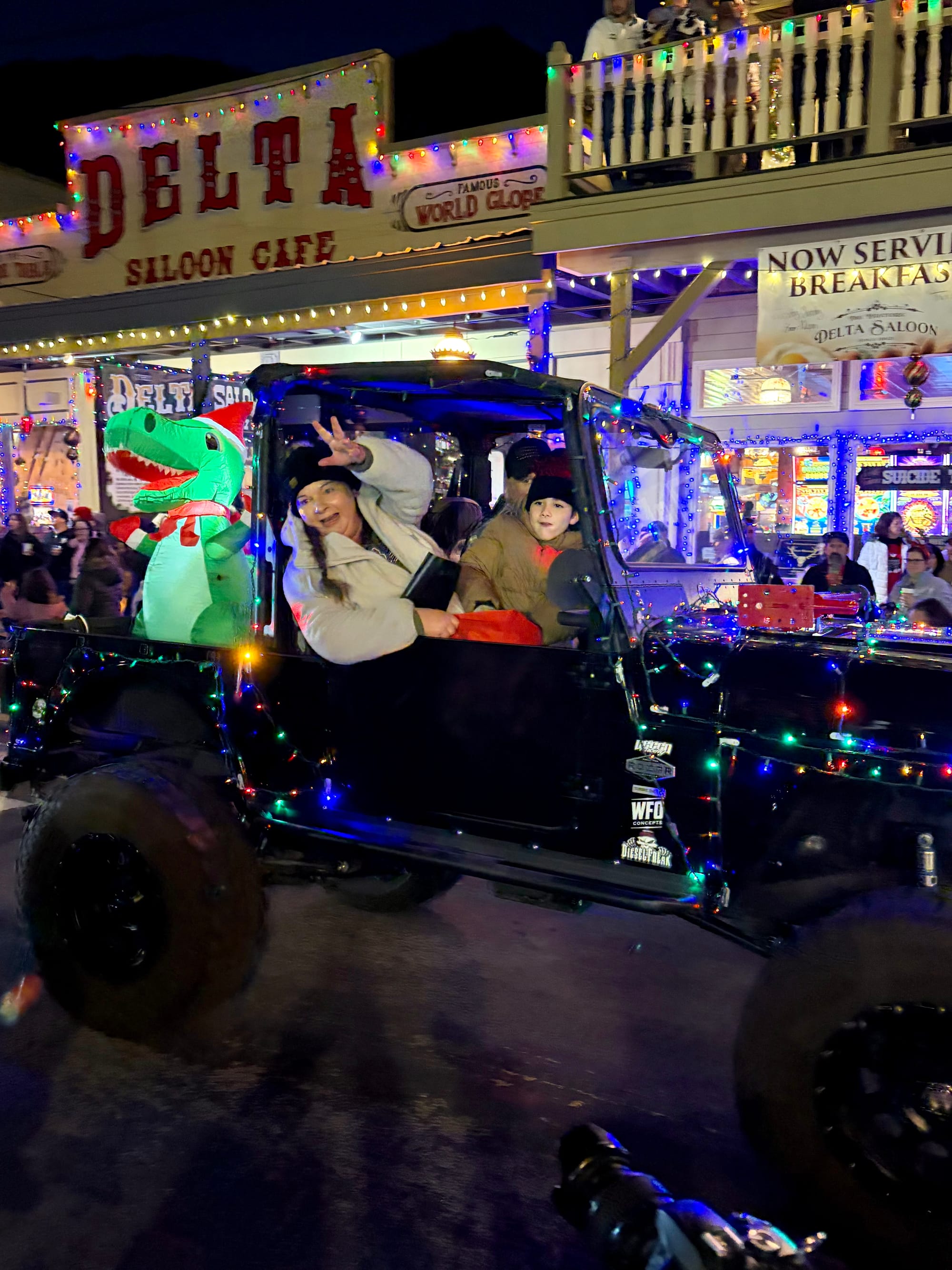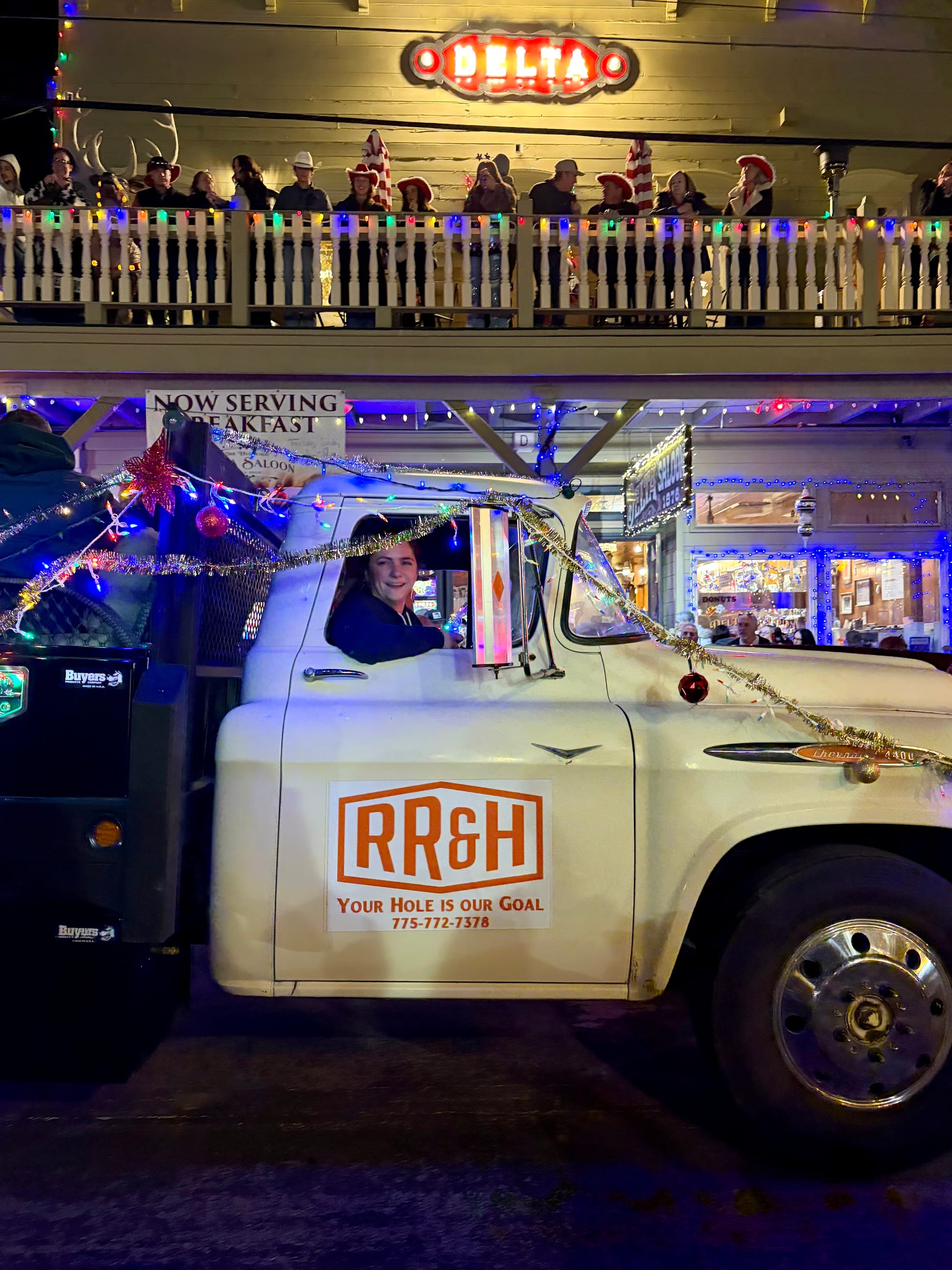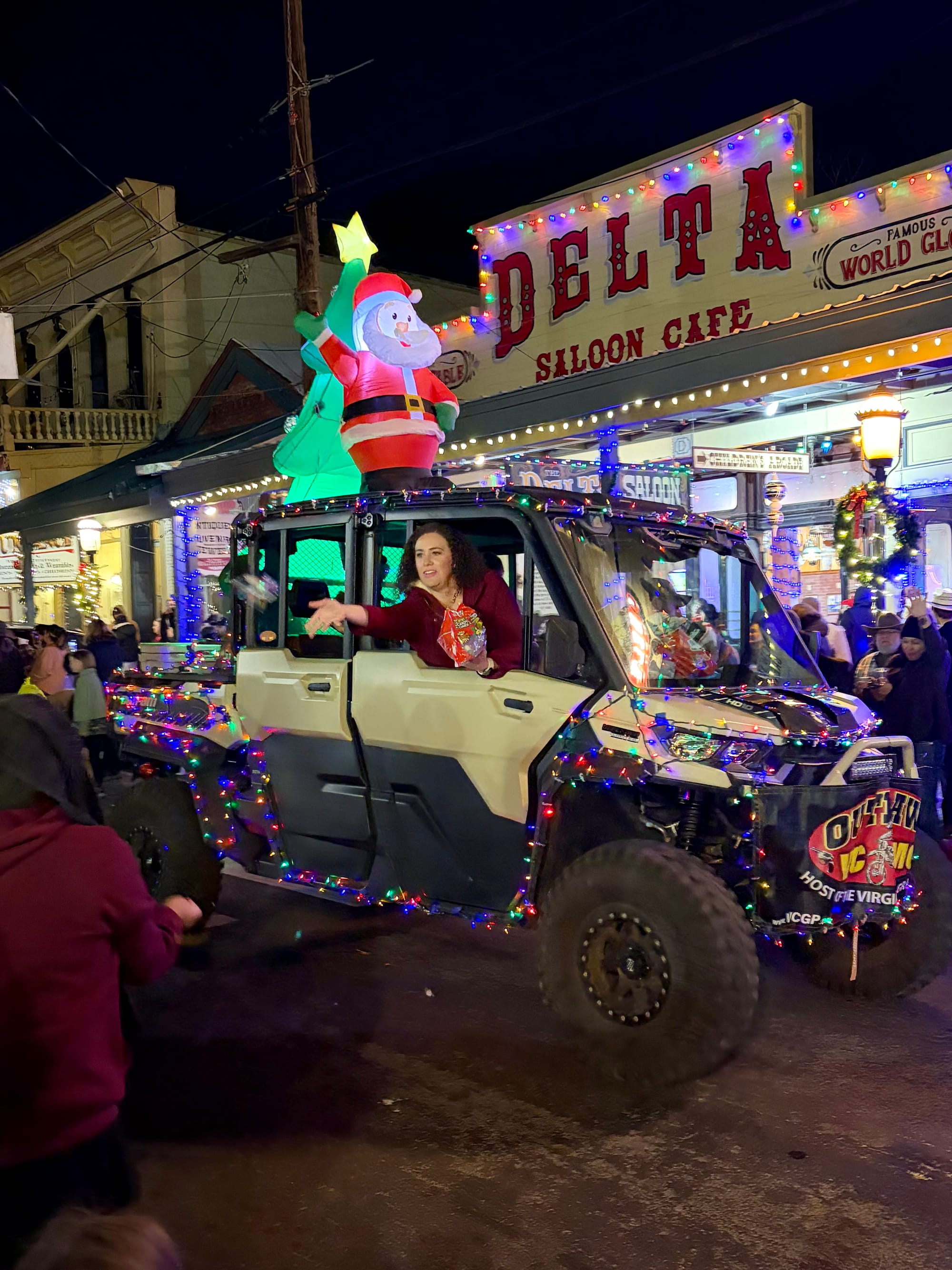 Trucks honked and revved their engines, grabbing the crowd’s attention. One truck carried an inflatable outhouse – a nod to Virginia City’s annual Outhouse Races. The Delta Saloon and Sawdust Corner Steakhouse carriages also joined the parade, decorated in true Christmas spirit.