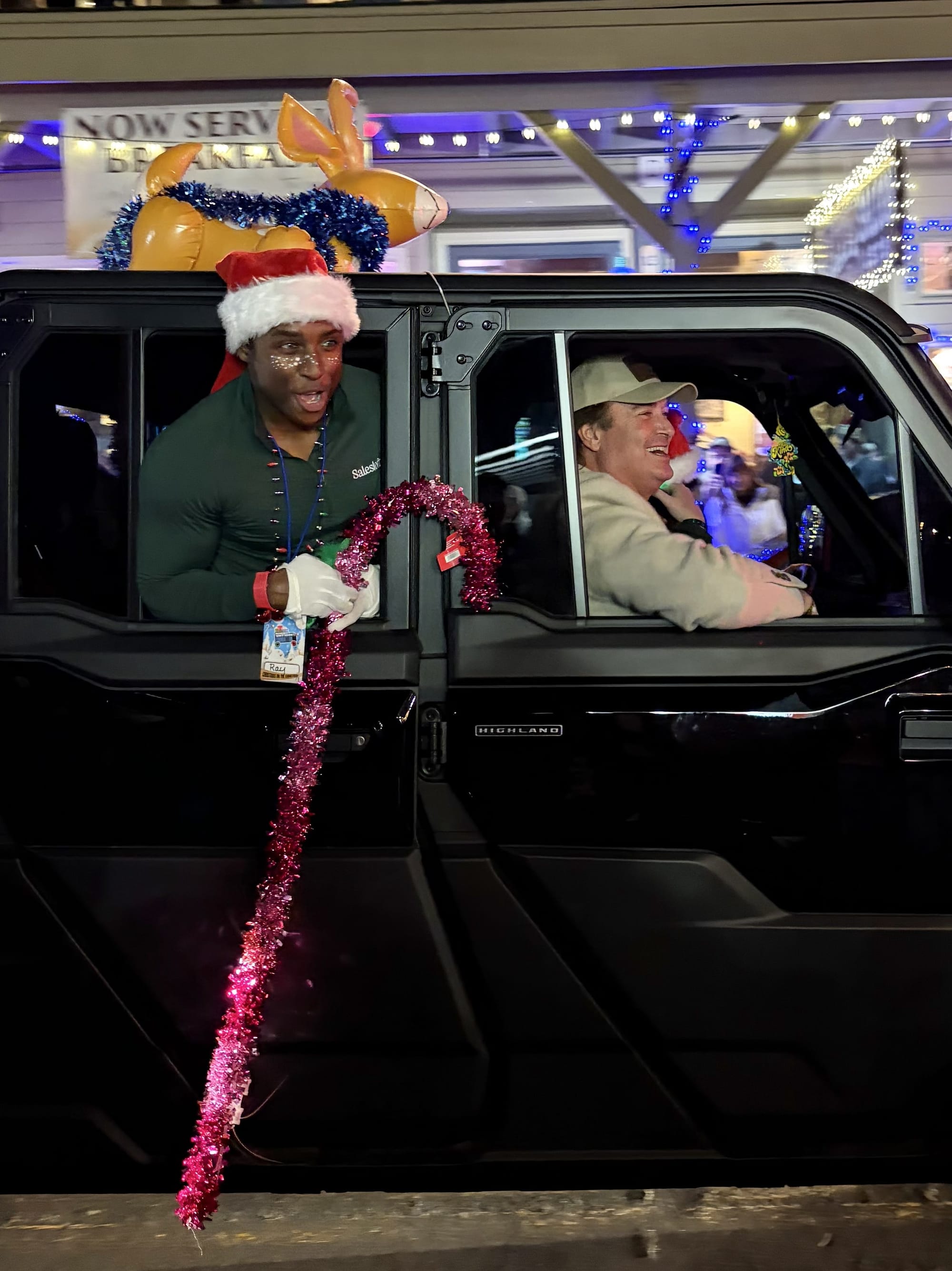 Decorated side-by-side vehicles began cruising down C Street, decorated with lights, playing Christmas music, and outfitted with unique decorations. Lights wrapped the hood and frames of vehicles, with inflatables including Frosty the Snowman, Santa, and the Grinch strapped to the back – one SxS vehicle carried an inflatable snow globe spelling, ‘Let it Snow’ with snow blowing out behind them. Kids exclaimed aloud which vehicles in the parade were their favorite while running around to grab flying candy.