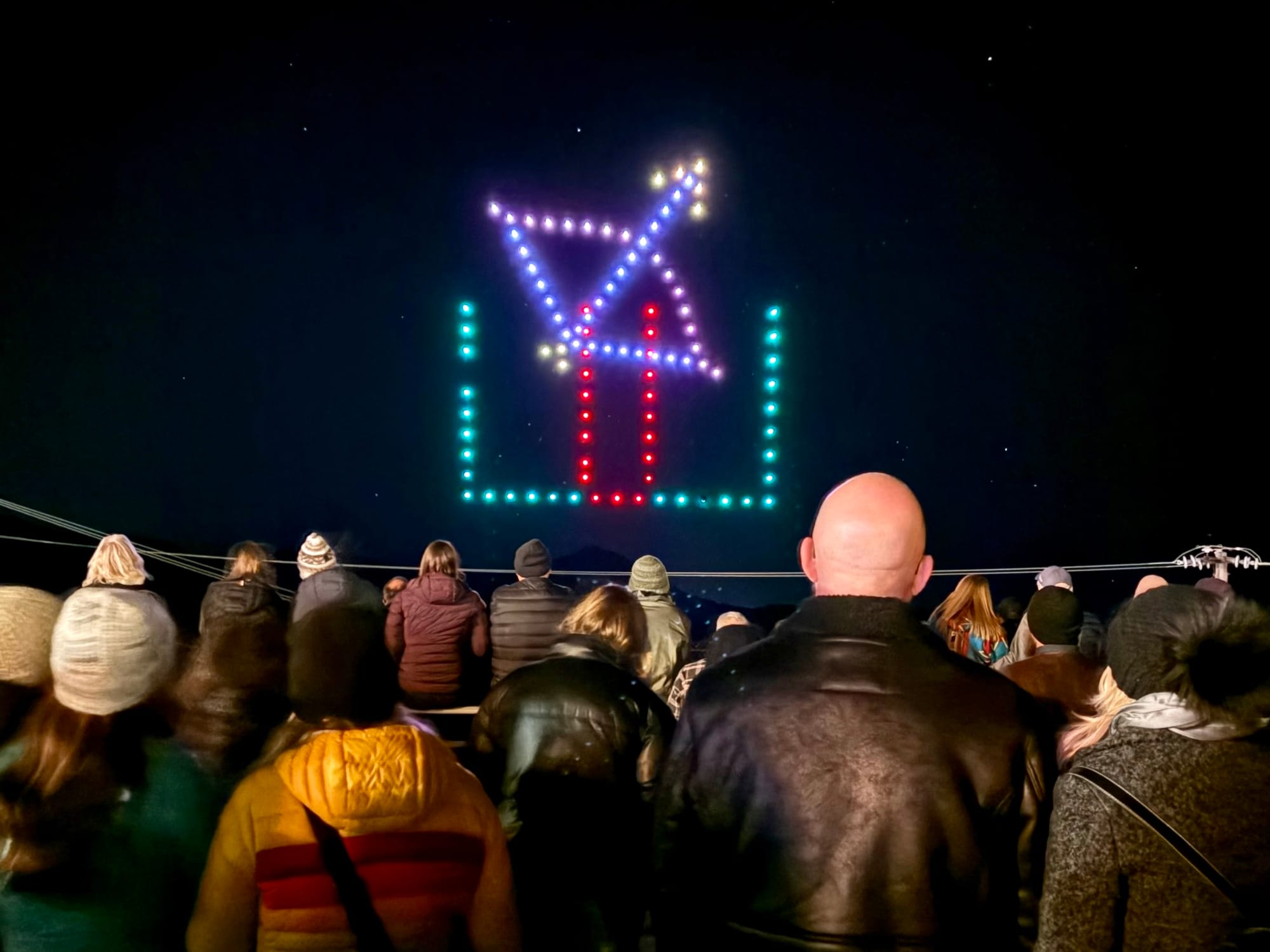 “What’s it going to be?” a father asked a group of kids. The kids began guessing the Christmas icon, as the drones buzzed around and changed colors. “Bells! It’s bells!” They cheered, excited as they recognized what they saw in the sky. Laughs echoed over the Comstock as a goofy elf took shape, with an assortment of colors making the elf pop in the dark night sky.