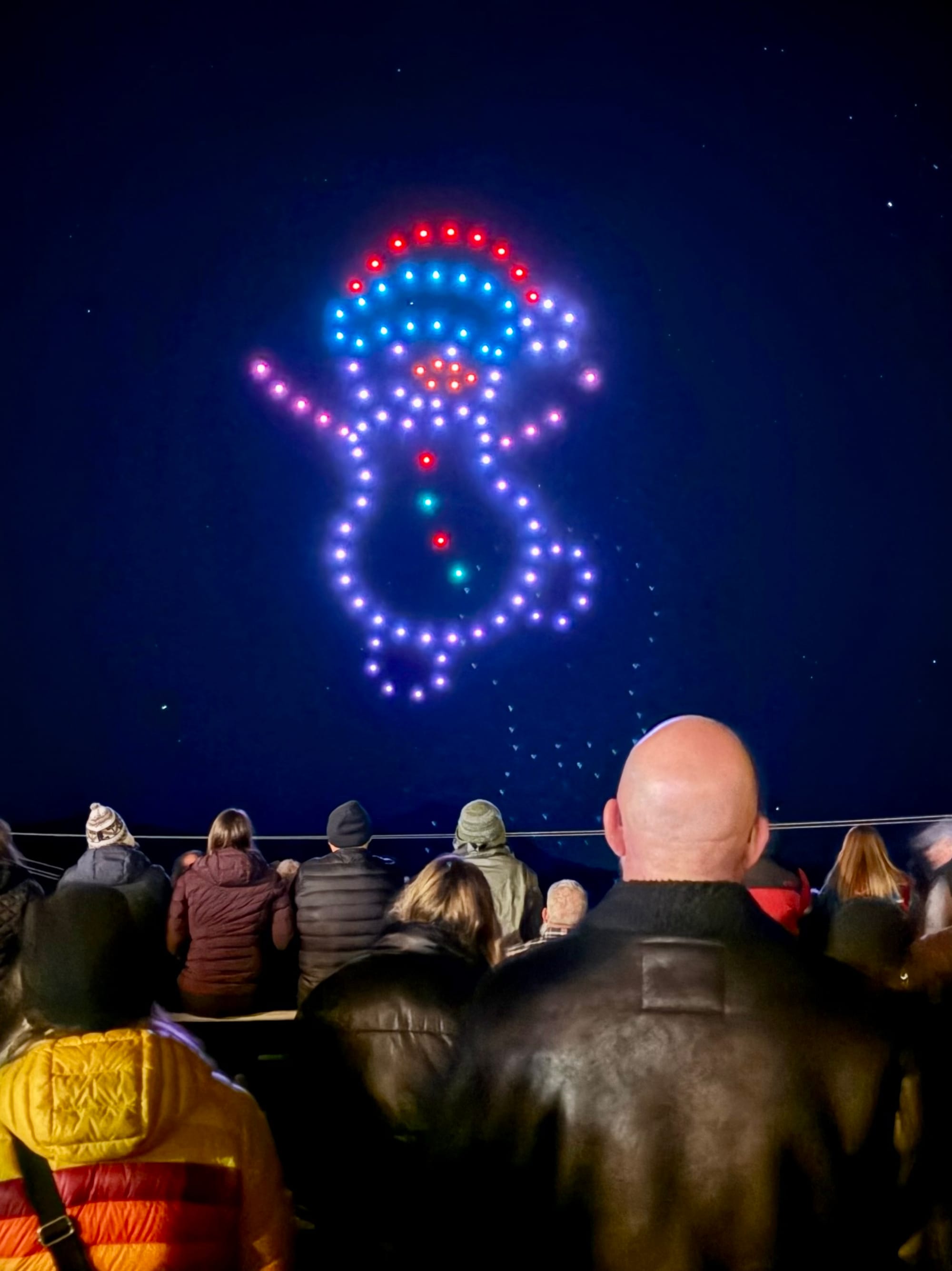 The drone show was a spectacular display of light and movement – a combination of silent fireworks and colorful constellations created using advanced technology. The drones changed colors and moved in perfect formation, bringing the images to life; they moved together in perfect unison and spacing to form Christmas features, including Santa in a sleigh with reindeer, a present, Christmas bells, and ornaments.