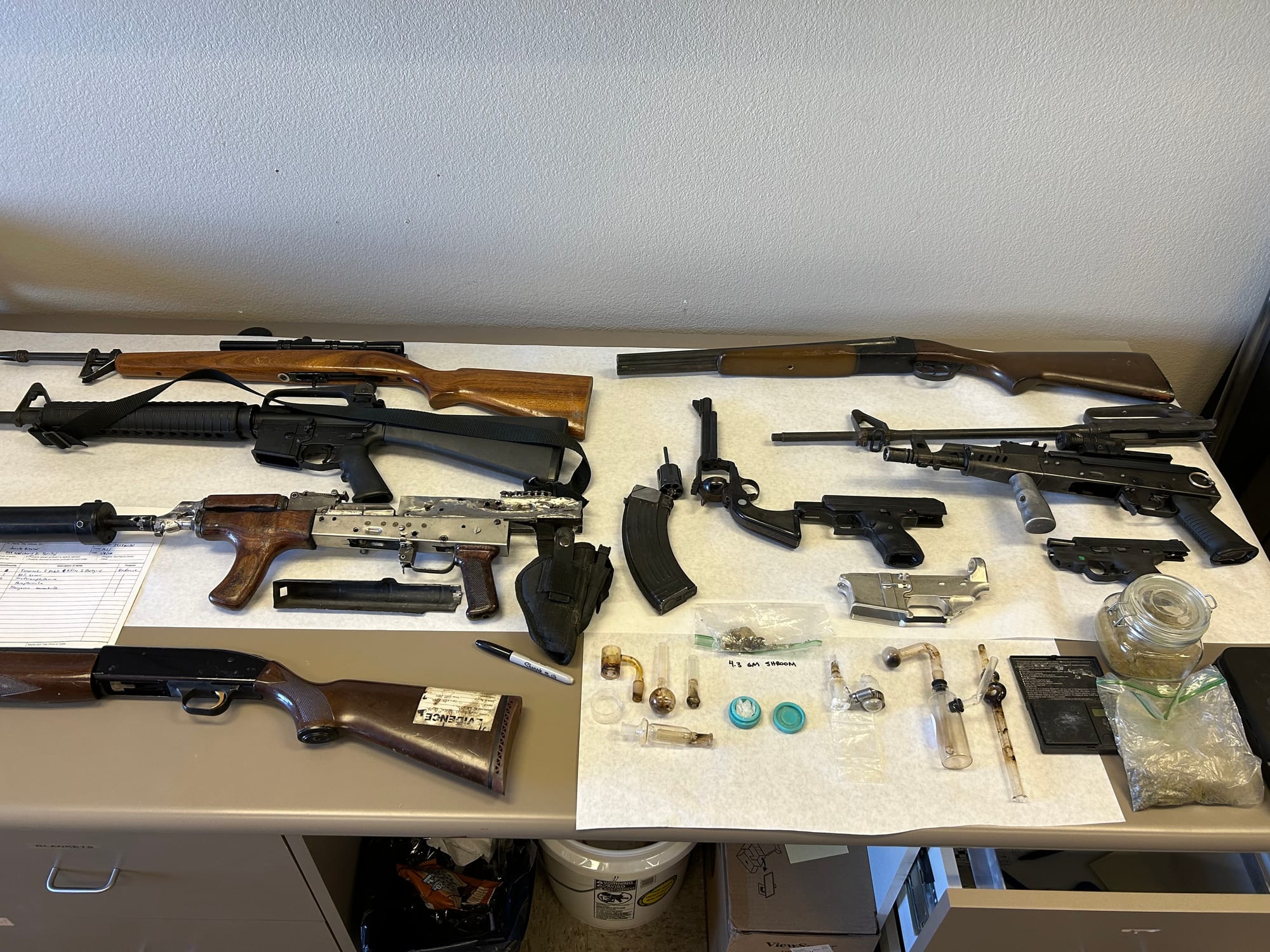During the subsequent search of the residence and property, investigators located suspected controlled substances, drug paraphernalia, and multiple firearms. Among the items seized were suspected methamphetamine, concentrated cannabis products, psilocybin mushrooms, and evidence of drug use and distribution. Investigators also located firearms and firearm components, including items believed to be unlawfully possessed under Nevada law.
