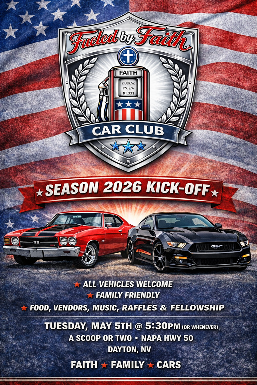 Help us welcome Fueled by Faith Car Club at A Scoop or Two/NAPA, Hwy 50 in Dayton on Tuesday, May 5 at 5:30 p.m.