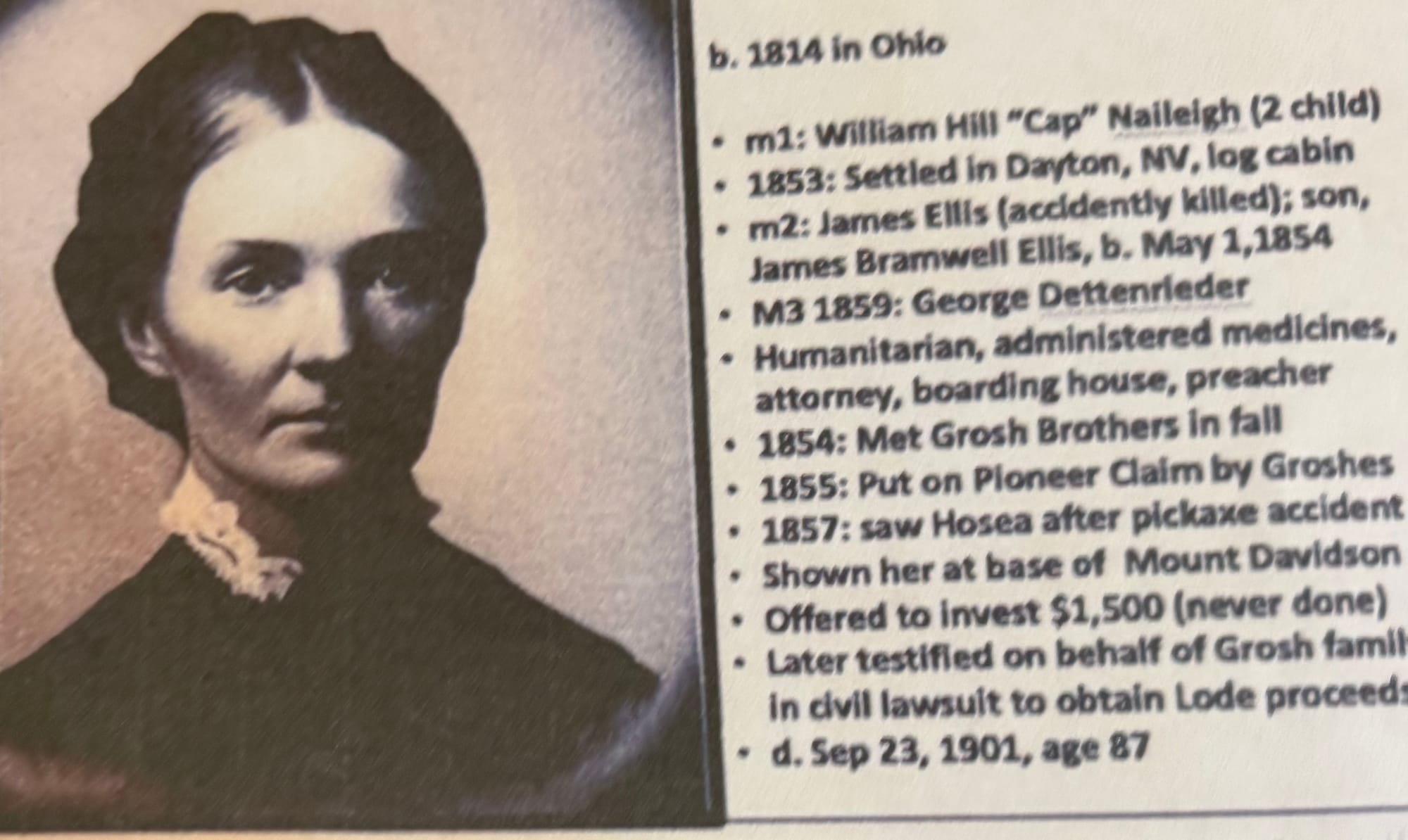 Nevada’s first historian, Laura Ellis Dettenreider, moved to Dayton in 1853 with her husband, James Ellis and two sons, William and Daniel (children from her first marriage to William Naileigh). She kept a daily journal of life in the tiny mining settlement of Dayton, where Nevada’s first gold was discovered in 1849.