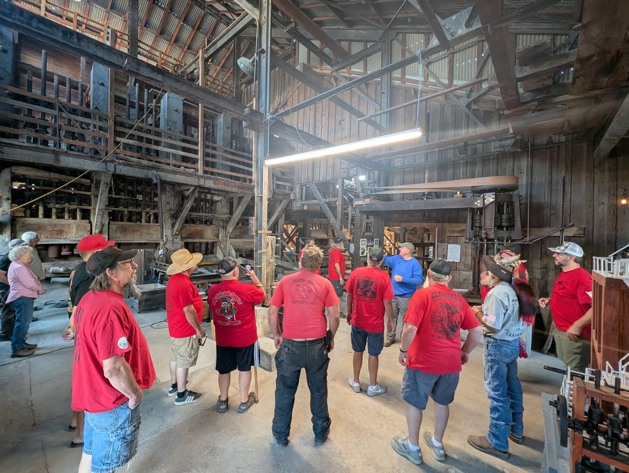 1: Event Leader Dan McCormick in his traditional attire on the left with members of the Fey family and event leader Brandon Wilding on the right. 2: Humbugs receive a lesson from Lee Brunell at the Donovan Mill. 3: Ed and Augie Fey at the JCB Hall. 4: The conclave at camp.