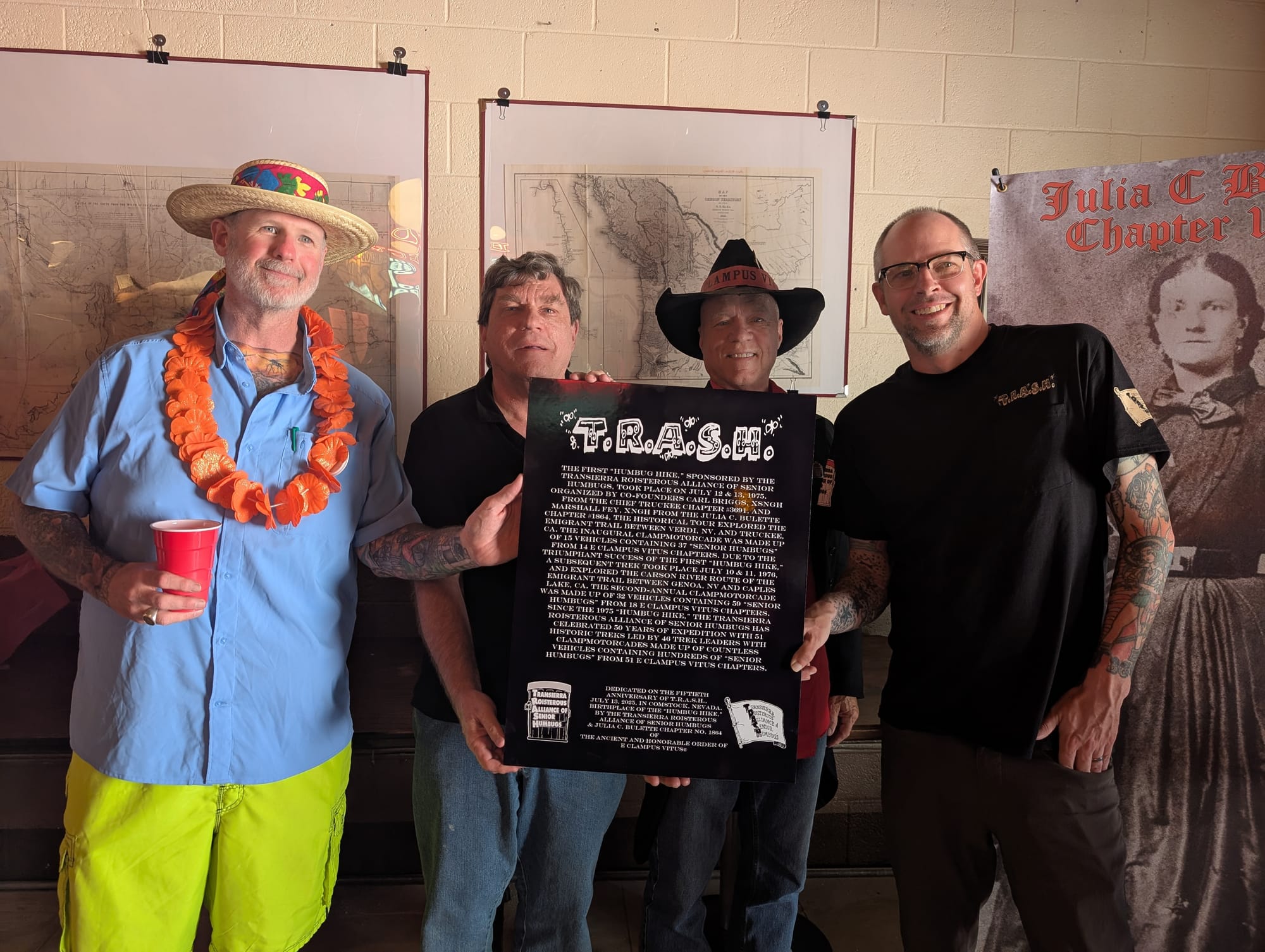 The Trans-Sierra Roisterous Alliance of Senior Humbugs, or T.R.A.S.H., is a group within E Clampus Vitus. A Humbug is (depending on the definition) either a joke, the past or present leader of an ECV chapter, or both. The T.R.A.S.H. group convenes once a year somewhere in the western US for a historical trek, and in doing so raises money for local historical societies and erects historical monuments. They also publish a history book for each event. This year, the group celebrated 50 years. It was formed in 1975 by Carl Briggs and Marsh Fey. The name Marsh Fey will be familiar to historians and longtime residents...Fey was the legendary slot machine expert, owner of the Liberty Bell restaurant, and one of the founding members of our own JCB 1864 chapter of E Clampus Vitus. He passed away last year and is missed by many.