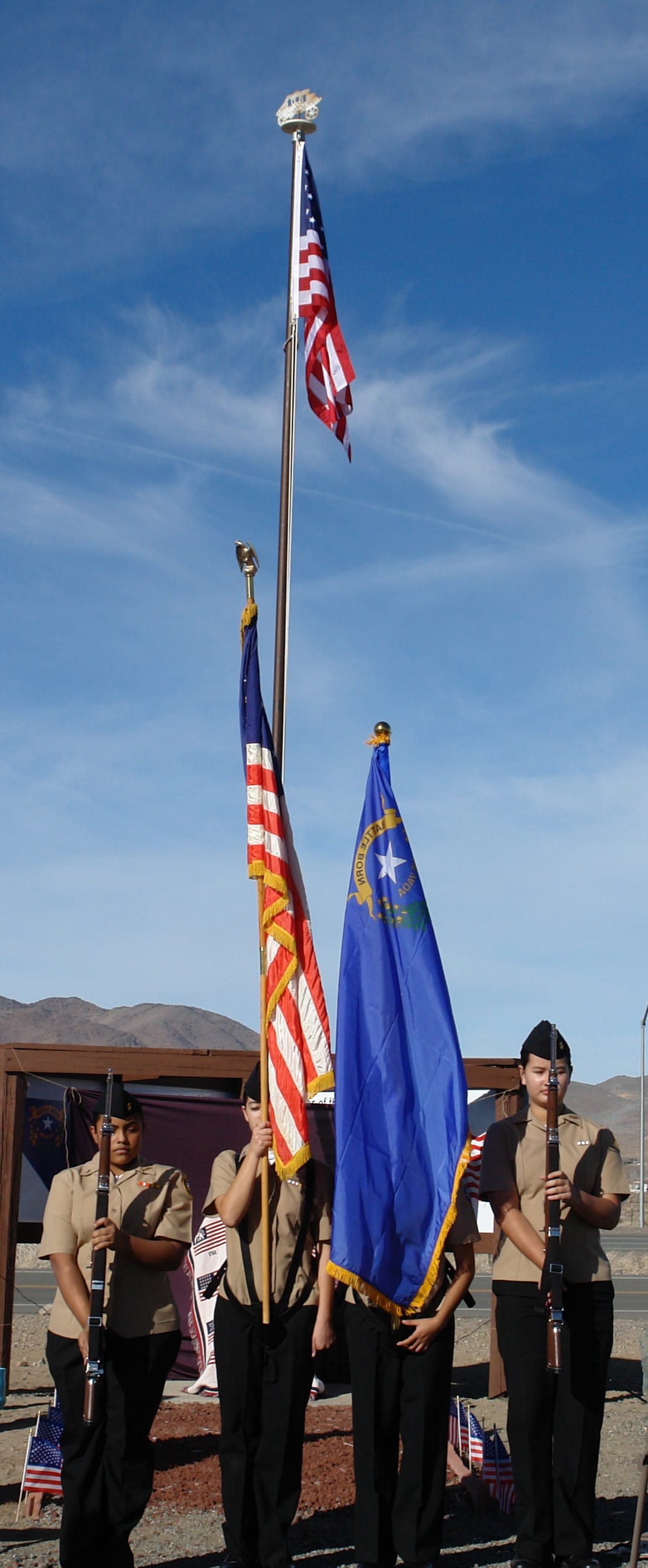 The rededication ceremony was truly unforgettable, especially having local resident and WWII veteran Ben Hagans in attendance. The Reno Elks Treble Makers Choir opened with a selection of patriotic songs, including the national anthem. The Carson High School NJROTC Color Guard posted the colors. Pastor Dennis Hubbard provided the invocation and benediction, while Lyon County Commissioner Tammy Hendrix offered the welcome address and rededication declaration. Jonathan Burnett rang a 70-pound miniature Liberty Bell for the Honor Bell ceremony (seven tolls), followed by a three-volley salute from Yerington VFW Post 8084 and Taps performed by the Veterans Coalition bugler.