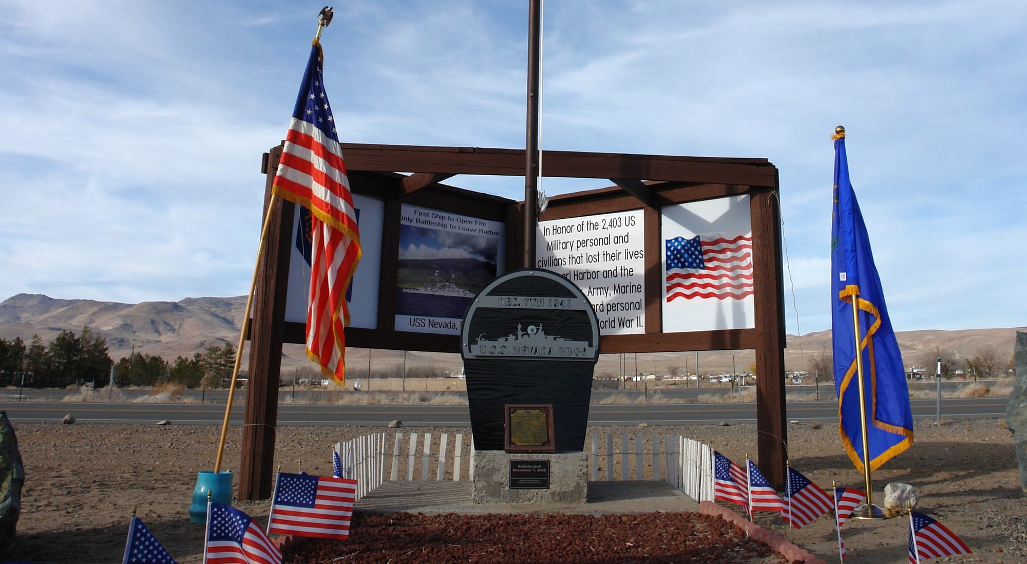 The original memorial was erected by the now inactive Fort Churchill VFW Post in 1991 to commemorate the 50th anniversary of Pearl Harbor. It was rededicated in 2018, but over time became overgrown and largely forgotten. However, the Stagecoach community and Silver Springs Area Chamber of Commerce came together to restore the memorial, ensuring that its history and significance are once again visible to the public.
