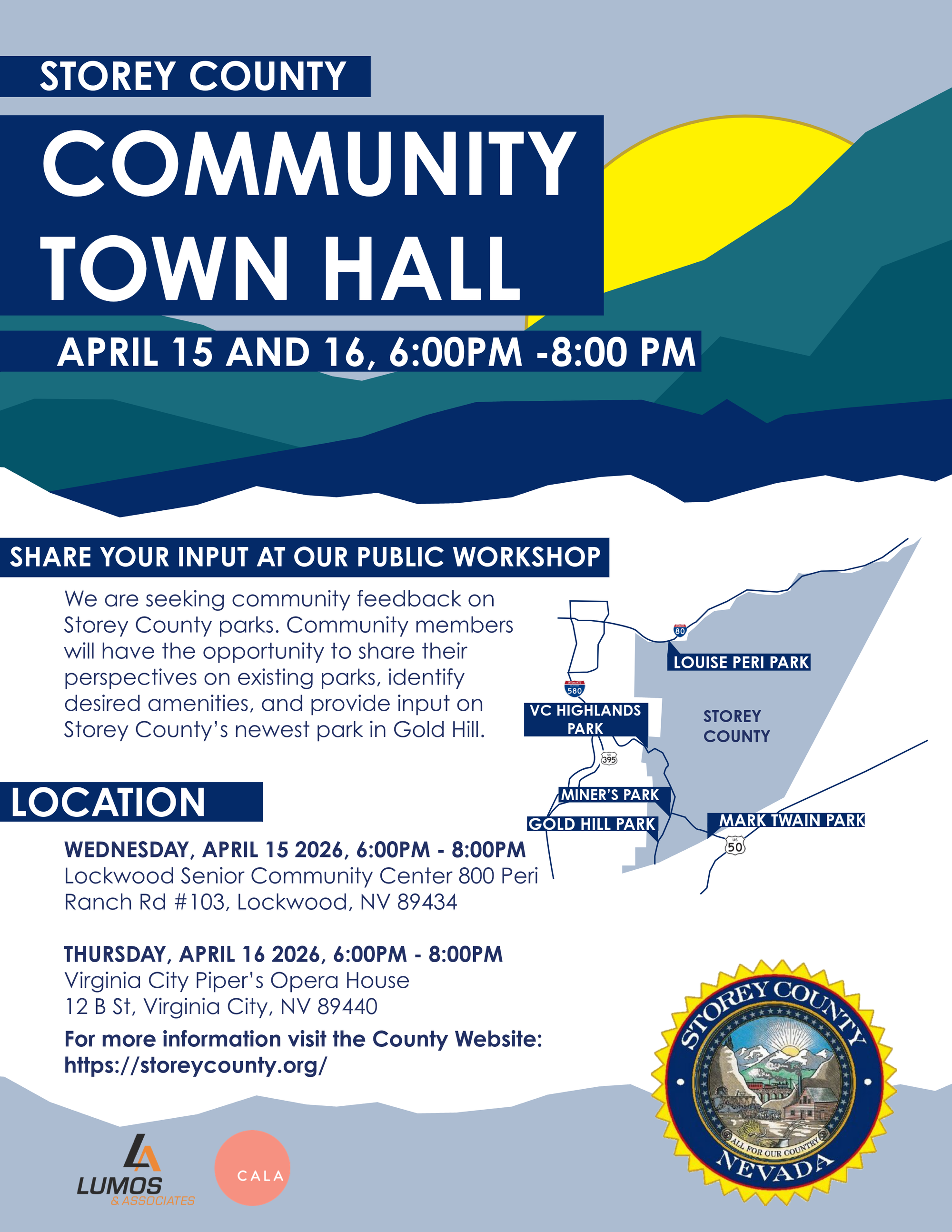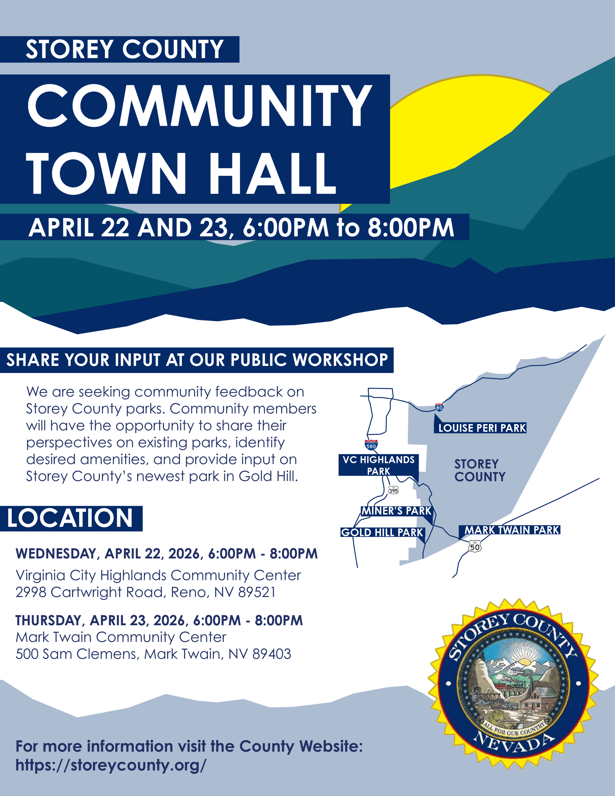 Storey County is hosting three town halls this April to engage residents in planning improvements to existing parks and providing input on the county’s newest park in Gold Hill.